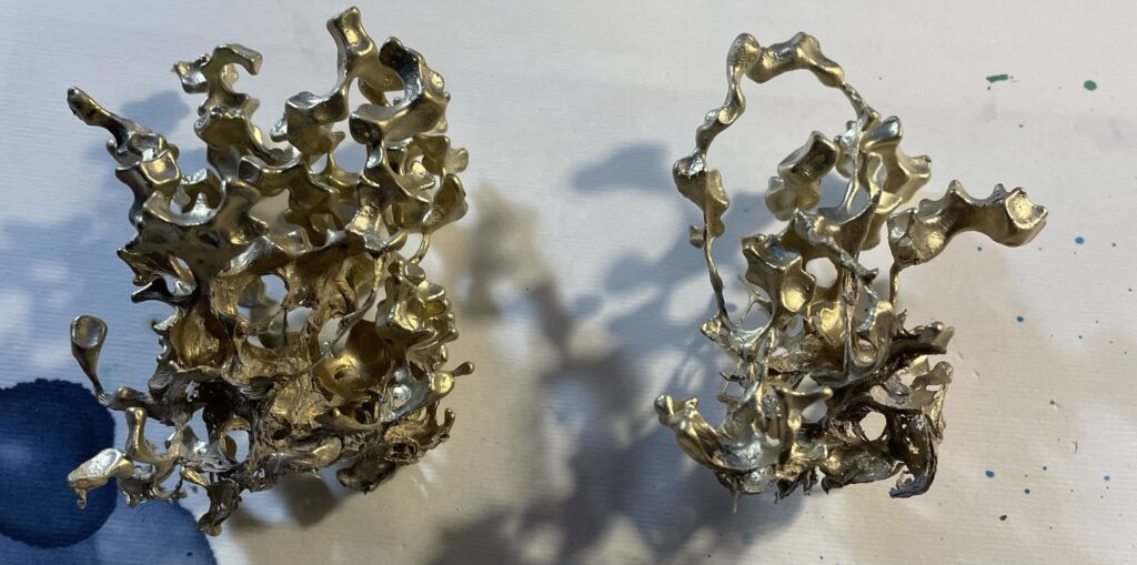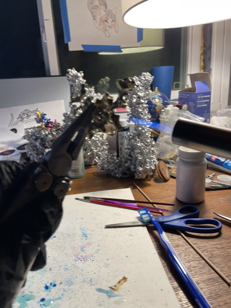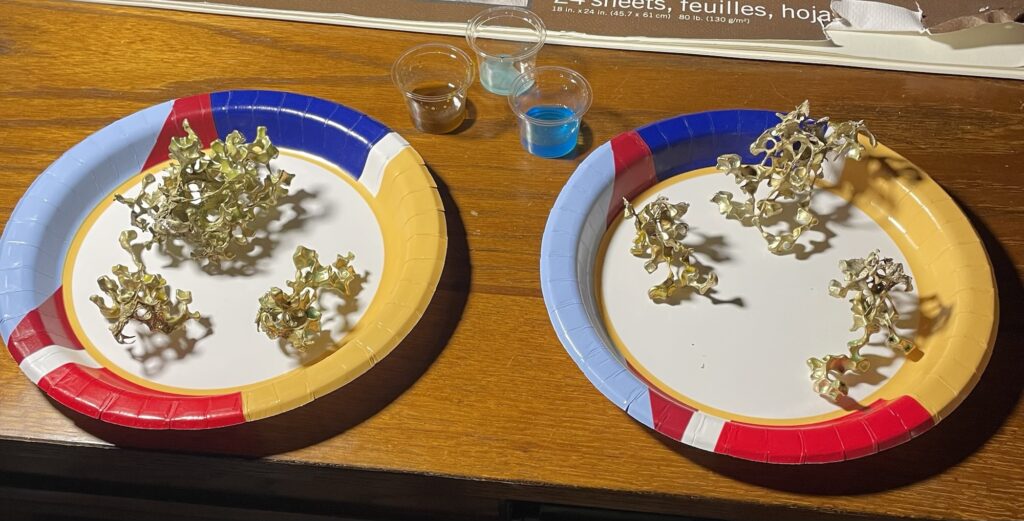 Patina day! I used three different formulas. A green patina solution, some blue cupric nitrate crystals in water and liver of sulfur. And then on one I just brushed them and the next I heated them and then used a toothbrush to stipple spray. we will see what they look like over the next few days.